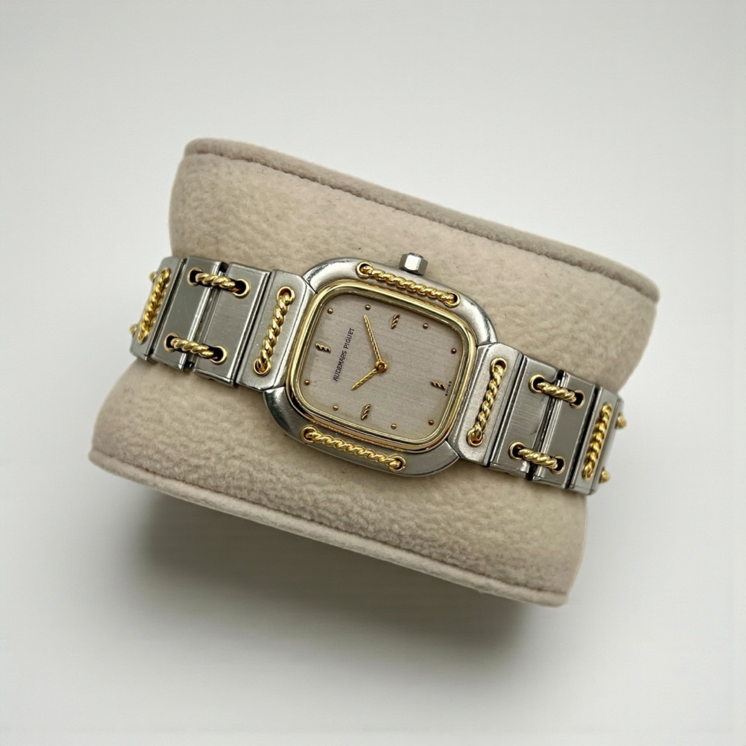 A classic icon of Cartier elegance, the Santos de Cartier Galbée blends timeless design with modern precision. This small 25mm model, crafted in luxurious 18k yellow gold and stainless steel, showcases the Maison’s signature Roman numeral dial and square bezel — a testament to refined style and engineering.